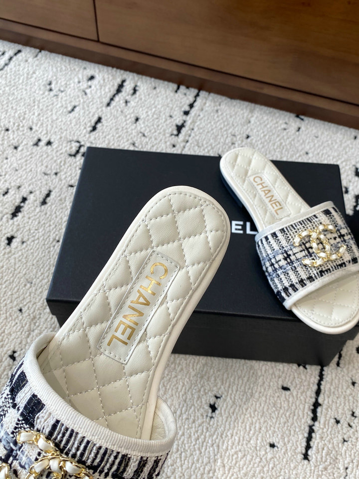 编号: 83A56B2GS300品牌: 香奈儿 ( CHANEL)码数: 35 36 37 38 39 描述(Describe):小香25P秋冬新品,双C钻logo拖鞋,鞋面采用原版定制皮料,内里垫脚均为丝绸羊皮,意大利进口真皮大底,(40/41定制)。