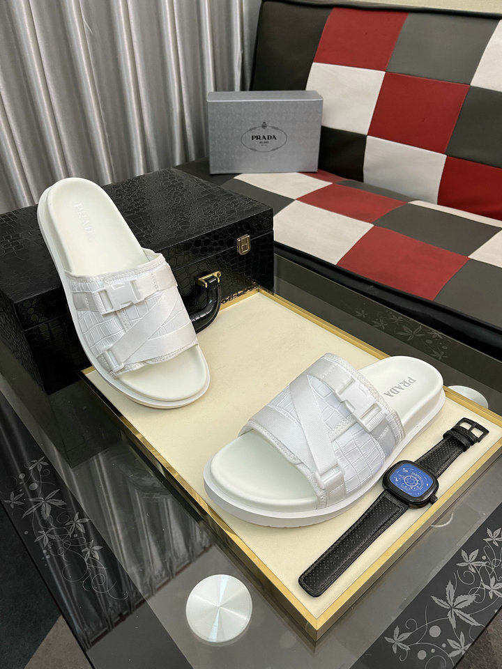 编号: 89A79C1GS230品牌: 普拉达 ( PRADA )码数:38 39 40 41 42 43 44描述(Describe):奢牌休闲拖鞋,进口原版羊皮,羊纹内里 高档舒适,原版大底轻盈耐磨!纯手工制作,细节决定品质! 2色可选。